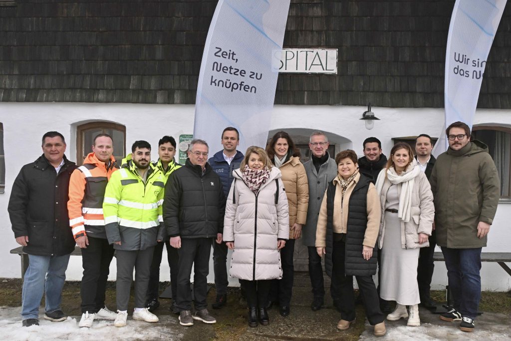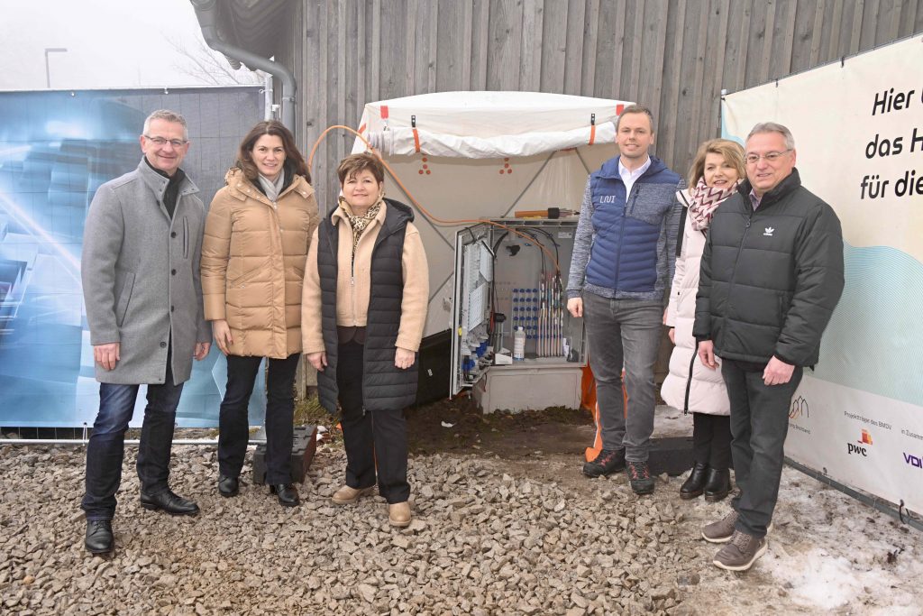Anlässlich der Wiederaufnahme der Bauarbeiten nach der Winterpause verschaffte sich Landrätin Tanja Schweiger gemeinsam mit den BürgermeisterInnen der beteiligten Kommunen sowie VertreterInnen der Projektpartner einen umfassenden Einblick in den aktuellen Projektstand. Im Mittelpunkt des Termins standen ein laufender Kabelzug mit anschließender Montage eines Glasfaser-Abschlusspunktes (APL) im Bereich des Spitals in Brennberg – ein sichtbarer Schritt vom Tiefbau hin zur konkreten Anbindung der Haushalte – sowie die Vorstellung eines KI-gestützten Mobile-Mapping-Tools zur digitalen Projektsteuerung.