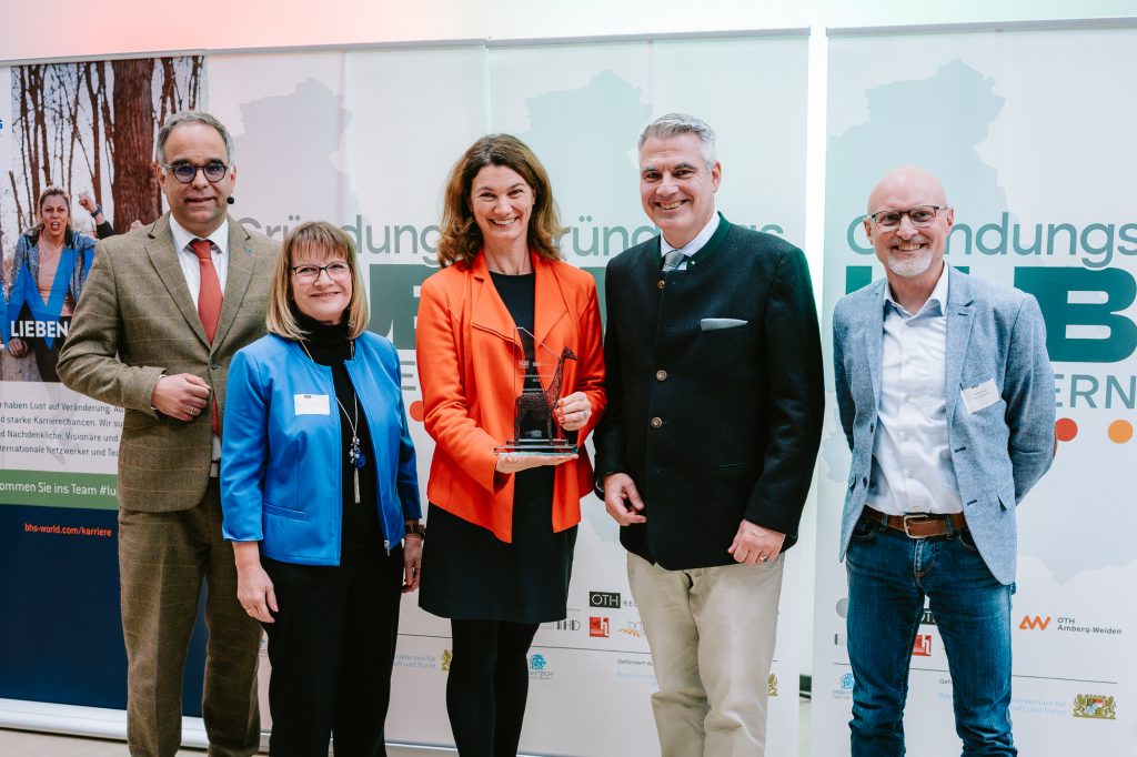 Das Gründerinnenteam von RocketMind überzeugte im Pitch-Wettbewerb und holte den ersten Platz im Jury- und im Publikumsvoting. Von links: Prof. Dr. Sevim Süzeroglu-Melchiors, Leiterin des Female Founders Programms an der OTH Regensburg, die RocketMind-Gründerinnen Lena Hiltel, Celina Bauer und Annalena Lüdeke, Prof. Dr. Sean-Patrick Saßmannshausen, Leiter des Start-up Centers der OTH Regensburg.
